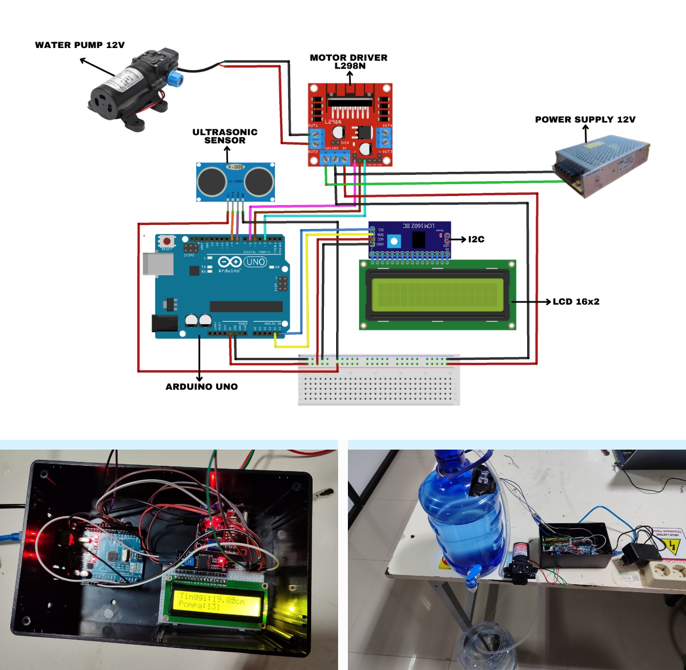 Water is a vital resource used in various fields, but maintaining water levels in tanks is often inefficient, leading to waste or damage. To address this, an automatic water level control system is designed using an HC-SR04 ultrasonic sensor, Arduino Uno, and L298N motor driver with a PID control algorithm. Testing shows the system maintains the water level close to the setpoint with fast response, low overshoot, and minimal steady-state error.